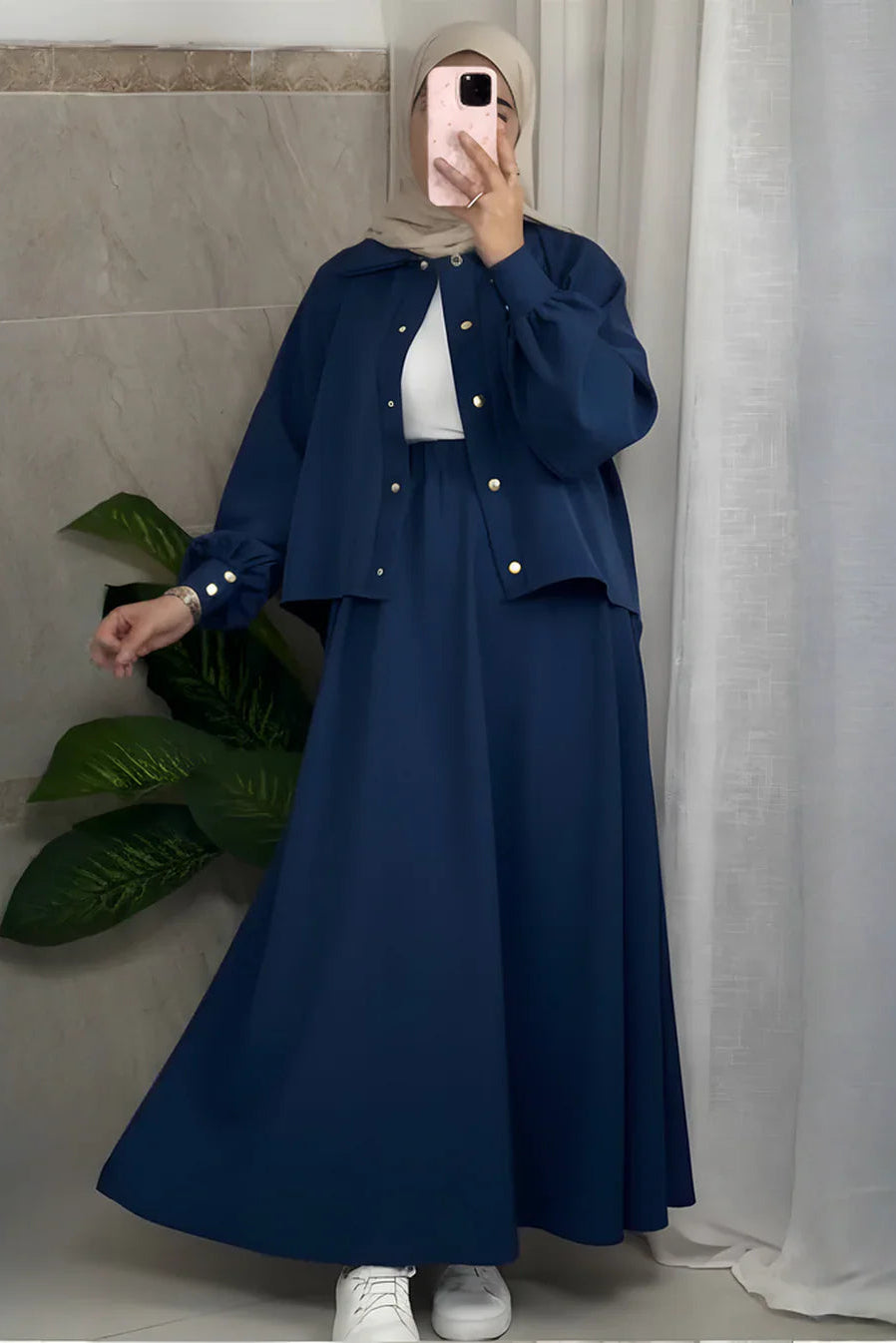 Style and details: Two piece outfit that has a classy button down with natural marble button detailing and seamless elasticated sleeves paired with trendy bottom that has an adjustable waist Wool peach fabric